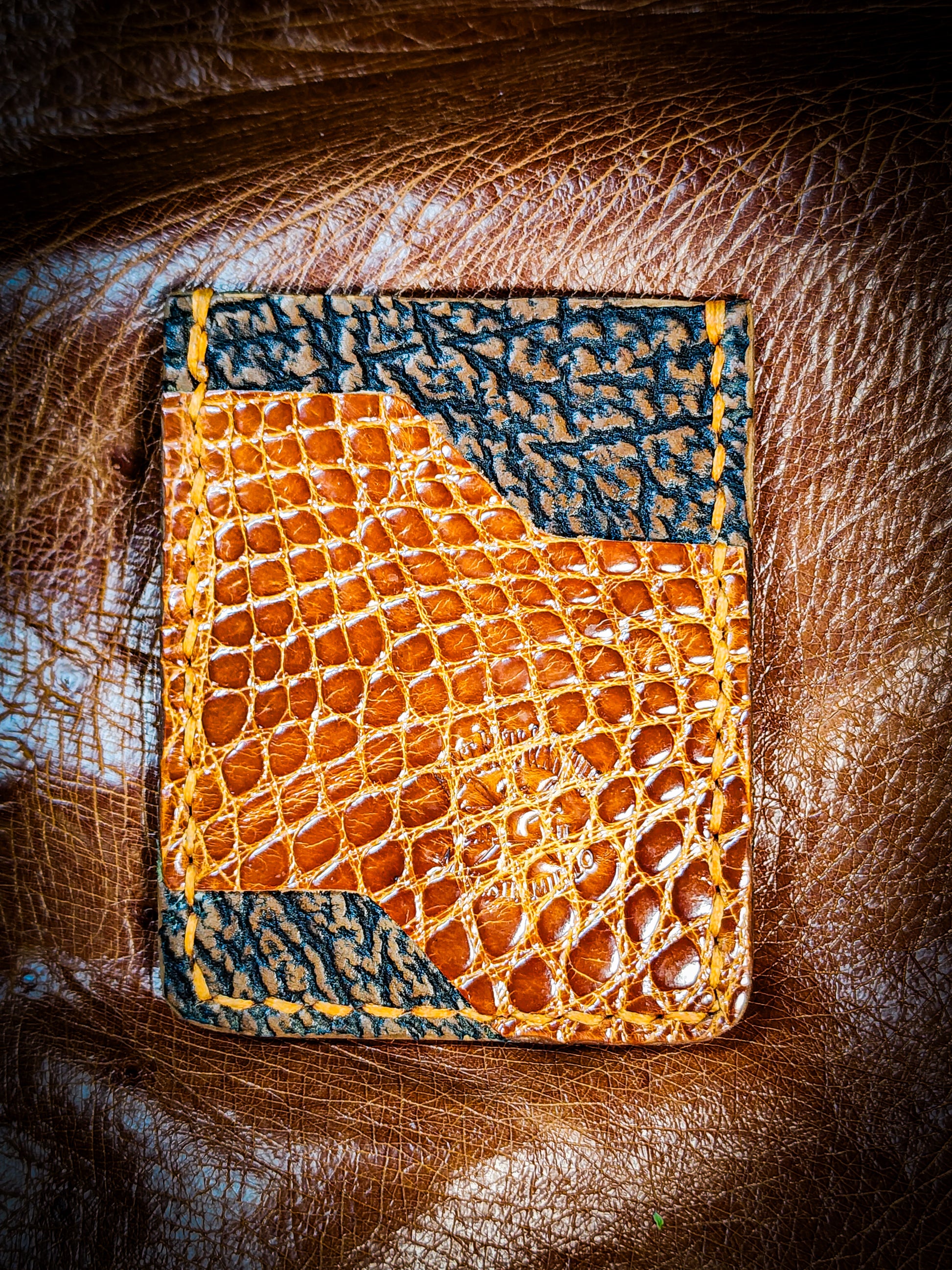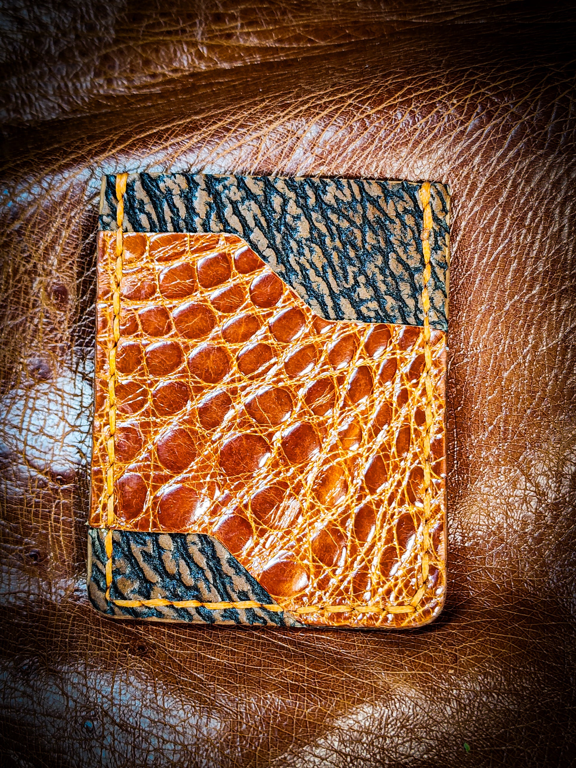 Minimalist Wallet - Nile Crocodile and Shark Skin with orange braided tiger thread